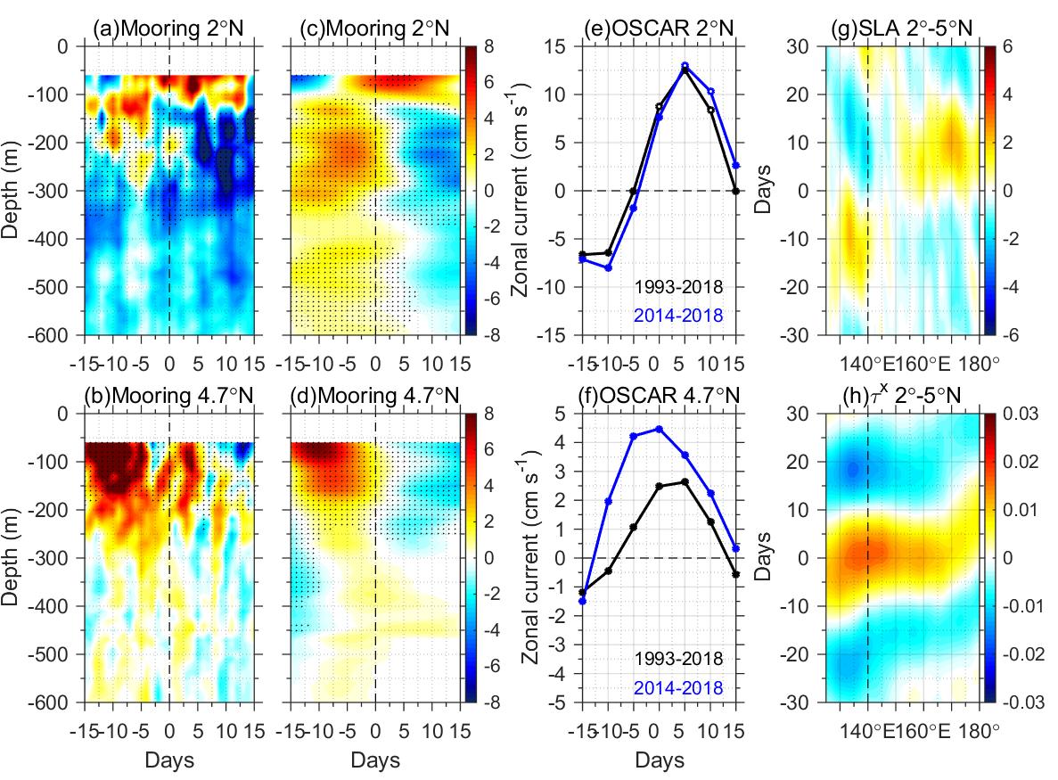 MJO是发生在热带地区的周期为30~60天的主要向东传播的大气振荡,能够引起大气强烈对流和西风爆发现象,进而影响ENSO发生。在以上认识基础上,研究人员进一步猜想MJO变异也一定会对次表层流的变异有所贡献。为研究该问题,研究人员使用热带西太平洋仅有的2套长达5年(2014-2018年)的潜标观测数据进行分析,发现次表层流同样具有相似的周期为20-90天的季节内振荡,并且该信号与大气MJO有关。MJO引起表层NECC在西风爆发之前(后)增强(减弱),其信号可以影响到水深600米,造成次表层流的变化幅度与平均流的量值相当。进一步的观测分析和模式实验证实:MJO通过引起西风爆发,激发出海洋Rossby波,从而引起次表层流的变异(Song et al. 2019)。