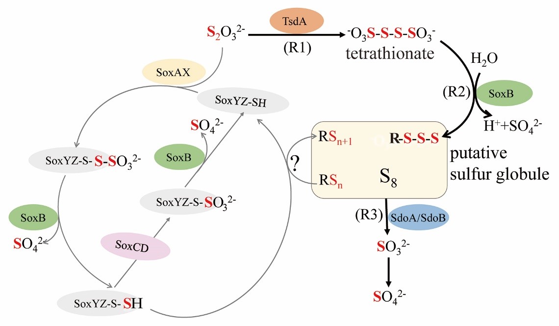 为深入了解该菌形成单质硫的分子机制,研究组分别借助蛋白组学、分子遗传学及分析化学等手段深入揭示了Erythrobacter sp. 21-3驱动氧化硫代硫酸钠形成单质硫的关键基因和相应功能,并提出了一种前人从未发现的新型硫氧化途径。在该途径中,第一步反应由Thiosulfate dehydrogenase (TsdA)蛋白介导,氧化两个硫代硫酸根生成连四硫酸根,进而Thiosulfohydrolase(SoxB)水解连四硫酸根上的磺酸基,剩余硫烷聚合形成多聚硫(S8)。 在特定情况下,多聚硫S8被Sulfur dioxygenase(SdoA或SdoB)氧化为亚硫酸根,最终氧化为硫酸根?;诤昊蜃榈慕徊窖芯拷峁允靖猛揪豆惴捍嬖谟诔喔司捌渌湫尉藕湍飧司盼⑸镏?,说明该新型硫氧化途径对深海硫元素循环有重要贡献。该研究成果不仅丰富了微生物硫氧化途径,也为解释我国南海冷泉喷口存在大量硫单质的成因及深海硫元素循环的新型机制研究提供了重要理论依据。