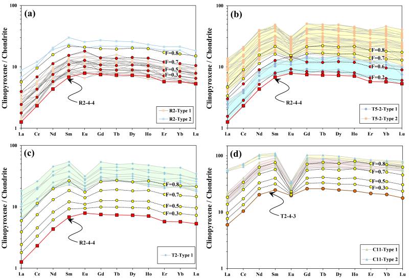 研究人员通过对单斜辉石的微量元素模拟发现,不同岩性内的单斜辉石可以通过玄武质岩浆发生单斜辉石+斜长石±斜方辉石±副矿物的分离结晶获得。此外,在安山岩中存在与玄武岩内单斜辉石成分相似的环带,表明了同源岩浆的充填、混合在不同岩性单斜辉石间普遍存在,并根据单斜辉石与熔体间元素分配系数获得了基性岩中单斜辉石平衡熔体成分。通过对平衡熔体的成分模拟,结果显示源区岩浆受到明显的俯冲沉积组分影响,且俯冲熔体的影响强于俯冲流体。