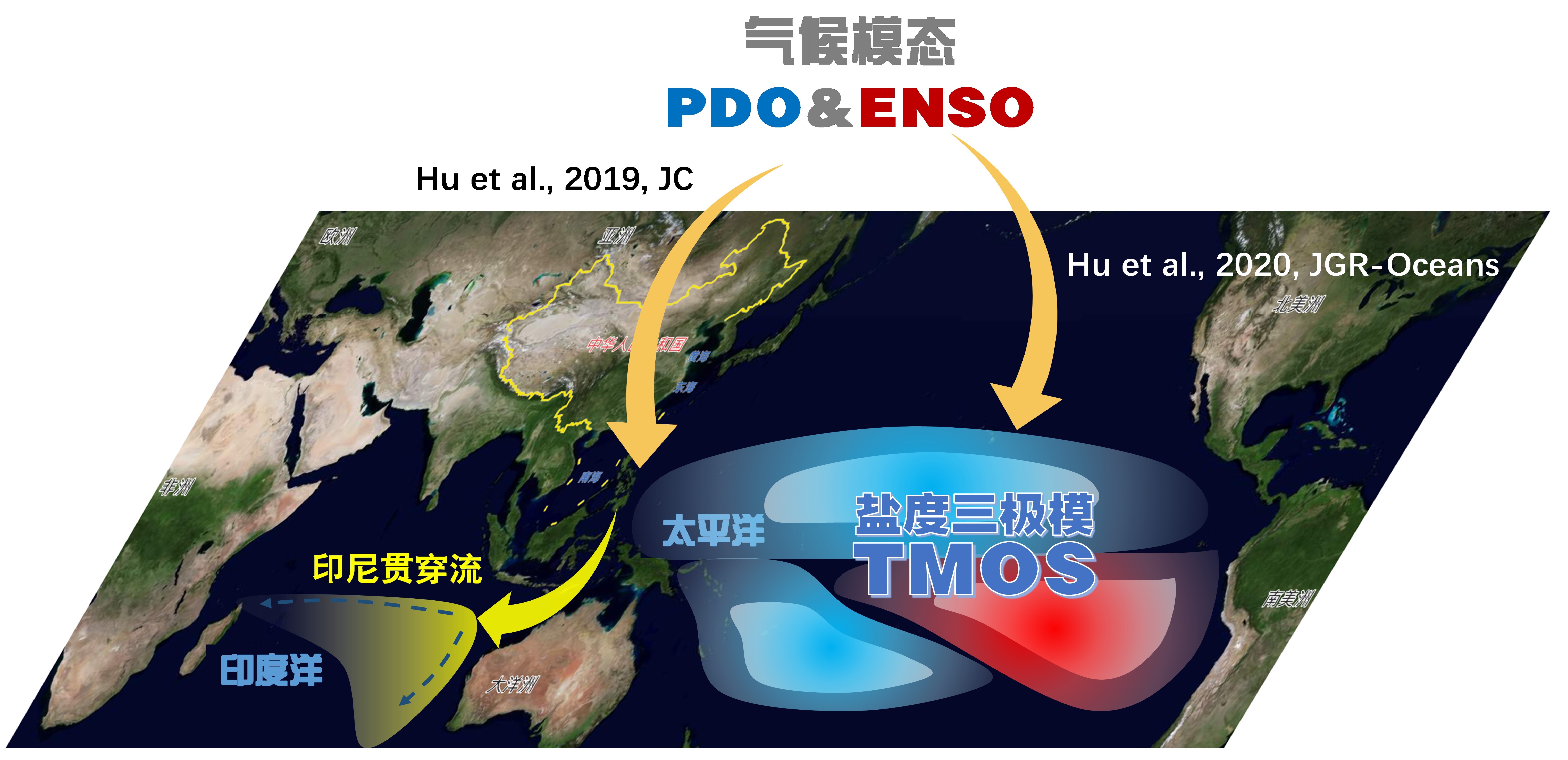 胡敦欣院士课题组胡石建研究员等人组成的研究团队,基于国际Argo计划获取的长时间盐度观测数据,以降水极其强烈的热带印太交汇区和印尼贯穿流海域为中心,对热带印度洋和热带太平洋海洋盐度的年际到年代际变化进行了系统研究。一方面,研究团队发现热带太平洋温跃层等密度面盐度的低频变化存在三极模态(Triple MOde of thermocline Salinity variability,简称TMOS),通过盐度收支分析和理论诊断阐明了TMOS模态的形成机制,并揭示了ENSO和太平洋年代际振荡(PDO)通过盐度平流调整在TMOS中的重要作用。