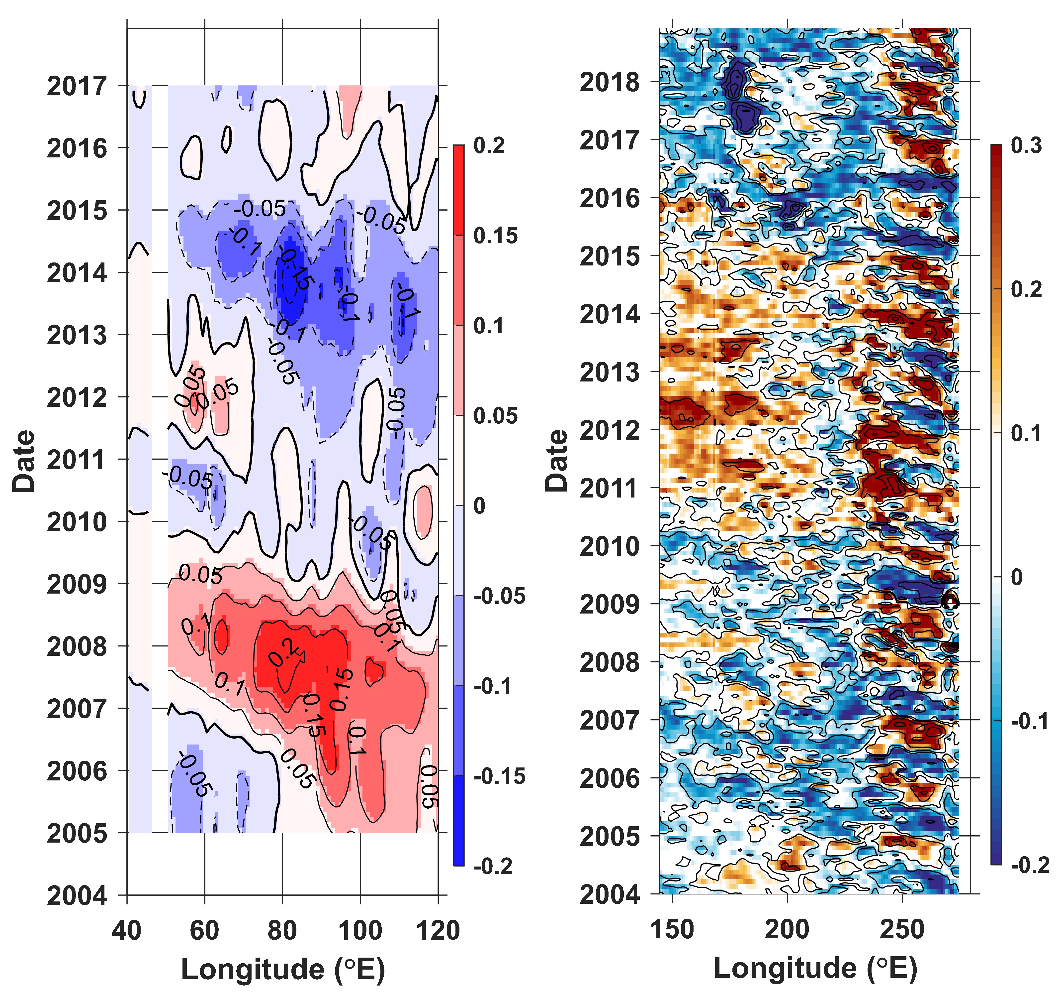 观测到的热带印度洋(左,15°S)和太平洋(右,10°N)温跃层盐度沿等密度面的西向传播特征(Hu et al., 2019, 2020)