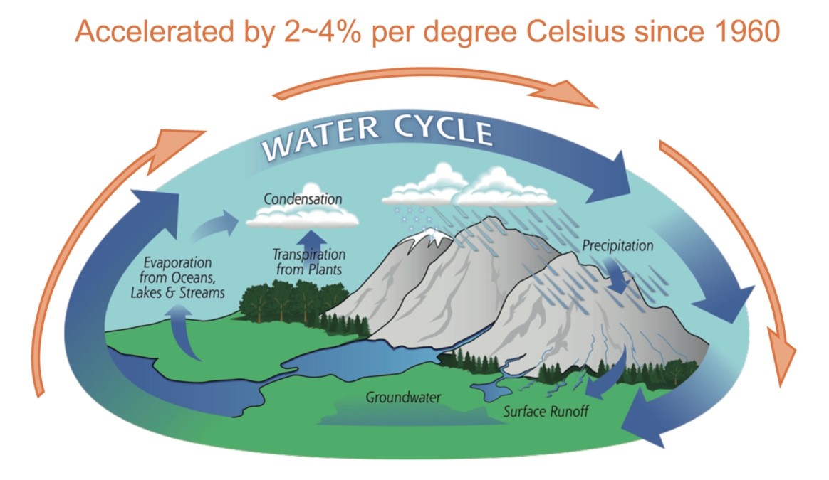红色箭头示意水循环在加速(图自NASA:https://gpm.nasa.gov/education/water-cycle)