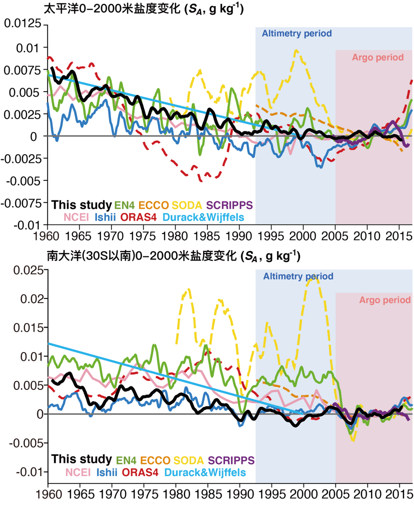 海洋盐度是水循环的一个指针,可用来估算水循环的变化。这是因为降水和蒸发使淡水在海洋和大气之间转移,直接导致海水盐度变化:降水增加对应海水盐度降低、蒸发加剧对应海水盐度增加。过去,不同的盐度研究估算出的过去半世纪水循环加速结果差异较大(2~8%/℃之间),其中一个原因是目前国际上用于此类研究的海洋盐度数据产品之间差异较大,例如,利用不同盐度数据计算的太平洋上层0~2000米深度平均盐度长期变化趋势之间的差异达到400%(图2)。