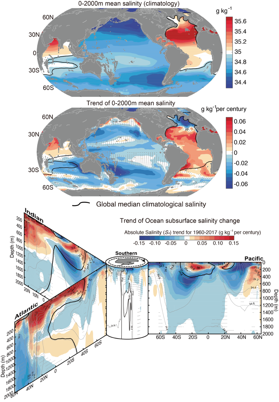 上图为上层2000米盐度的气候平均态。中图为上层2000米盐度的变化线性趋势(1960-2018年)。下图为各个海盆纬向平均从0到2000米的盐度变化趋势
