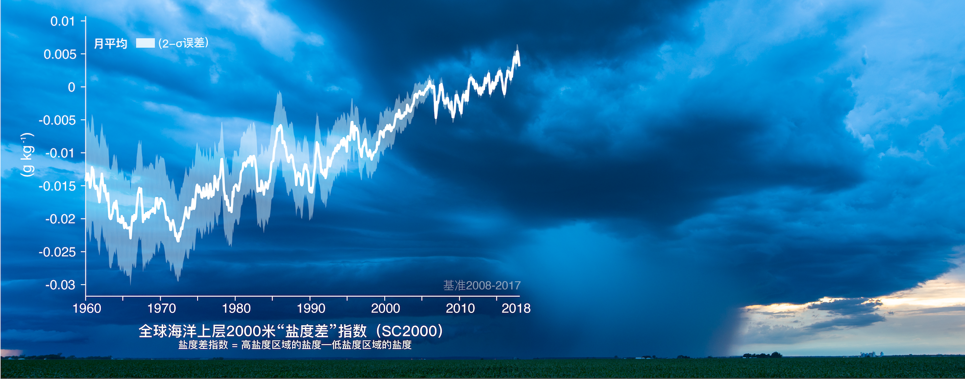 “盐度差指数”(Salinity-Contrast index)定义为高盐度区域的盐度变化和低盐度区域的盐度变化之差,这里“高”或“低”是相对于过去几十年的全球海洋平均盐度而言。因此,如果该指数增加,则表明“咸变咸、淡变淡”现象更为明显。背景图:积云和降水 (图片: 王习麟)