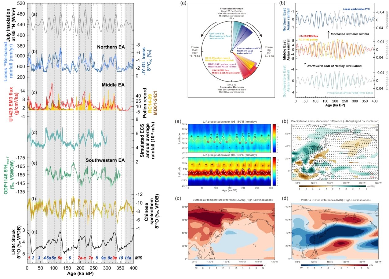 (左)晚第四纪东亚降水演化时空对比;(右上)东亚不同区域降水强度相位演化;(右下)模型模拟结果(降水、温度以及风场强度)