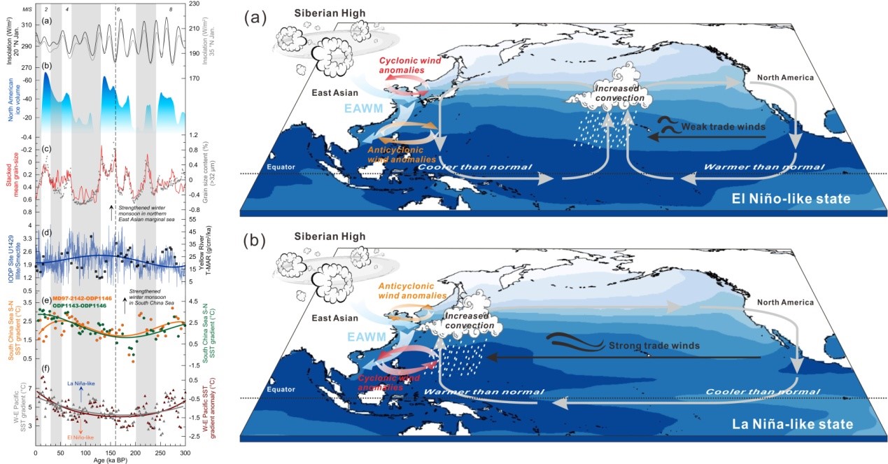 对于冬季风演化,研究显示过去30万年以来冬季风强度在东海和南海呈现反向演化的长期趋势,而全新世以来的指标重建与模拟结果也都显示出了同样的现象。考虑到单一的北半球高纬冰量变化无法驱动东亚冬季风的这种空间差异演化,并结合现代过程中厄尔尼诺-南方涛动(ENSO)对东亚冬季风的影响,研究人员提出了类ENSO过程的控制作用。在长时间尺度上,当热带太平洋趋于类厄尔尼诺过程时,冬季风在东亚东部边缘海区域增强,而在南海减弱;而当趋于类拉尼娜过程时则相反。该研究揭示了热带低纬过程对于第四纪东亚冬季风空间差异演化的驱动作用。在全球变暖所造成的极端厄尔尼诺和拉尼娜发生频率升高的背景下,东亚冬季风空间差异演化可能将导致东亚南、北部更多的极端冷冬或暖冬的出现。因此,本研究不仅加深了我们对于气候变化低纬驱动理论的认识,同时对于东亚区域将来的长期气候预测也有重要的指示意义(Zhao et al., 2019, Geophysical Research Letters)。