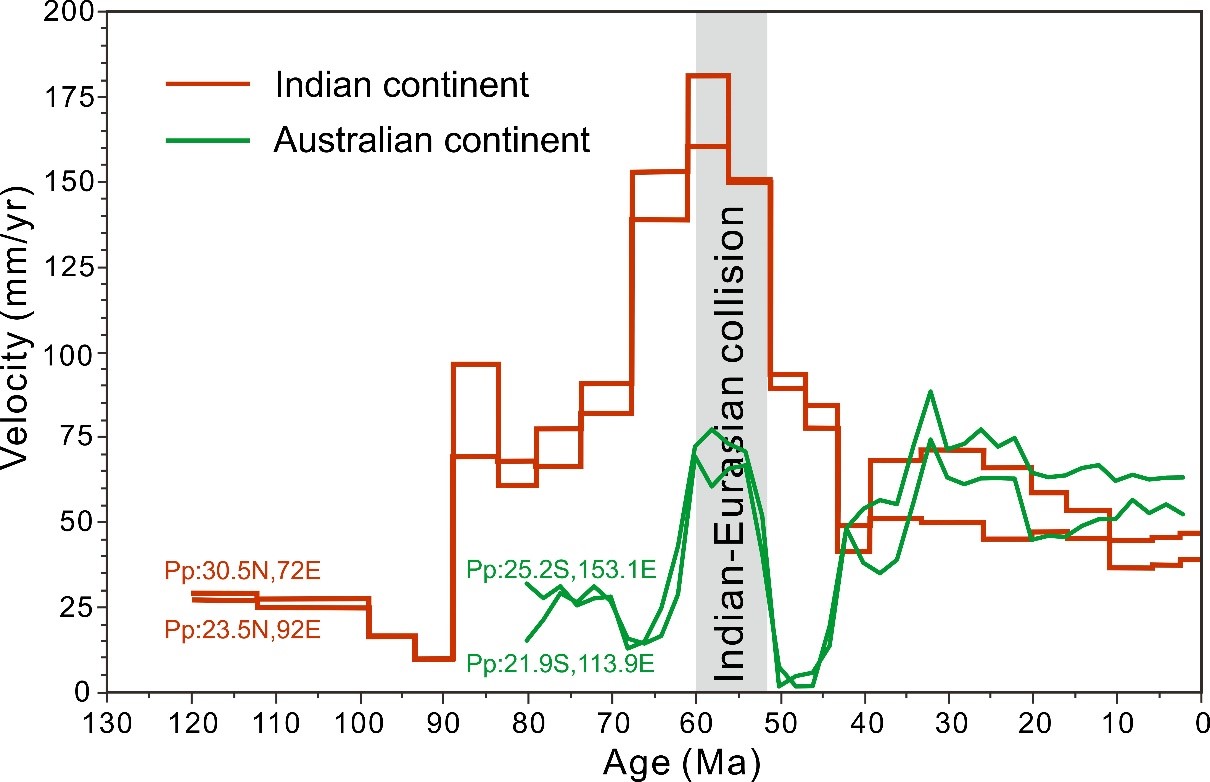 印度大陆与澳大利亚大陆漂移速率图。印度大陆在~六千万年时速率达到最大值,在~5500-5200万年迅速降低;澳大利亚大陆运动速率在~5300-5000万年也迅速降低,在~5000万年时速率接近0;两大板块运动速率都迅速降低的时间表明硬碰撞的开始,这可能是导致太平洋板块运动方向改变的主要驱动力