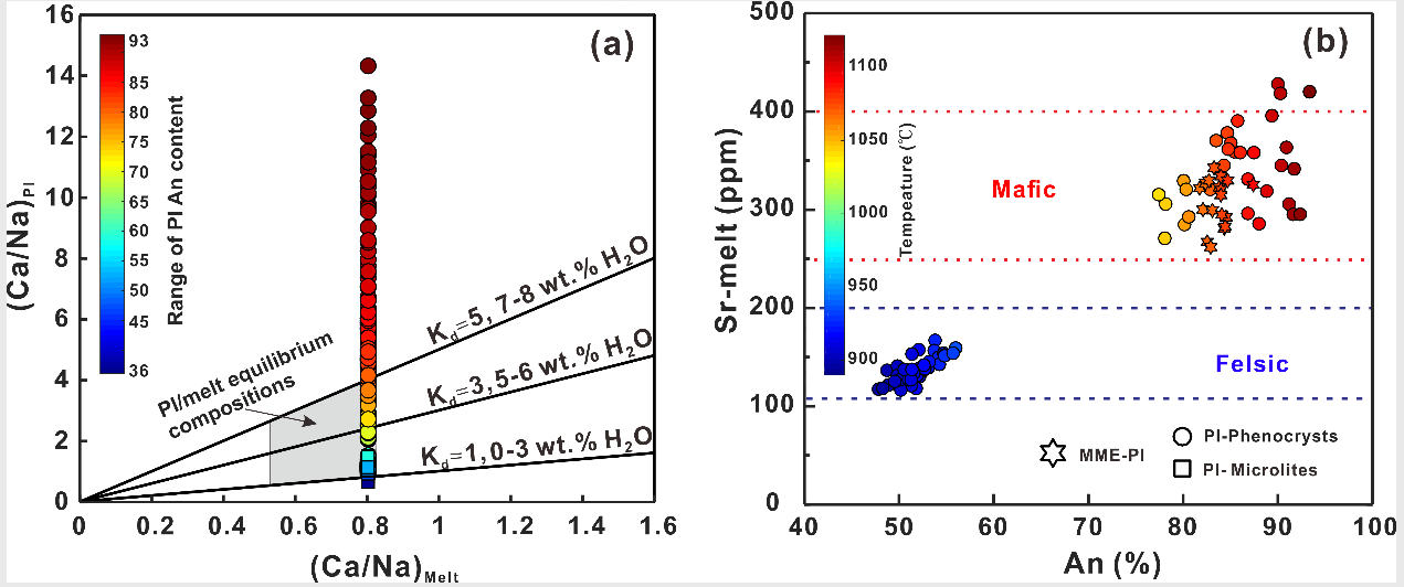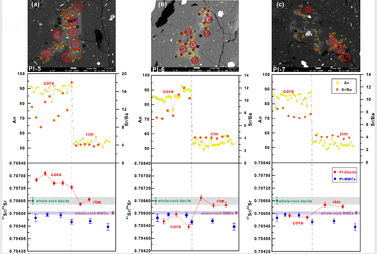 此外,斜长石核部高Ca/Na比值及其平衡熔体高Sr含量均表明它们与寄主英安质岩浆不平衡,因而来自于深部不同的铁镁质岩浆系统,被上升岩浆夹带进入浅层岩浆房。