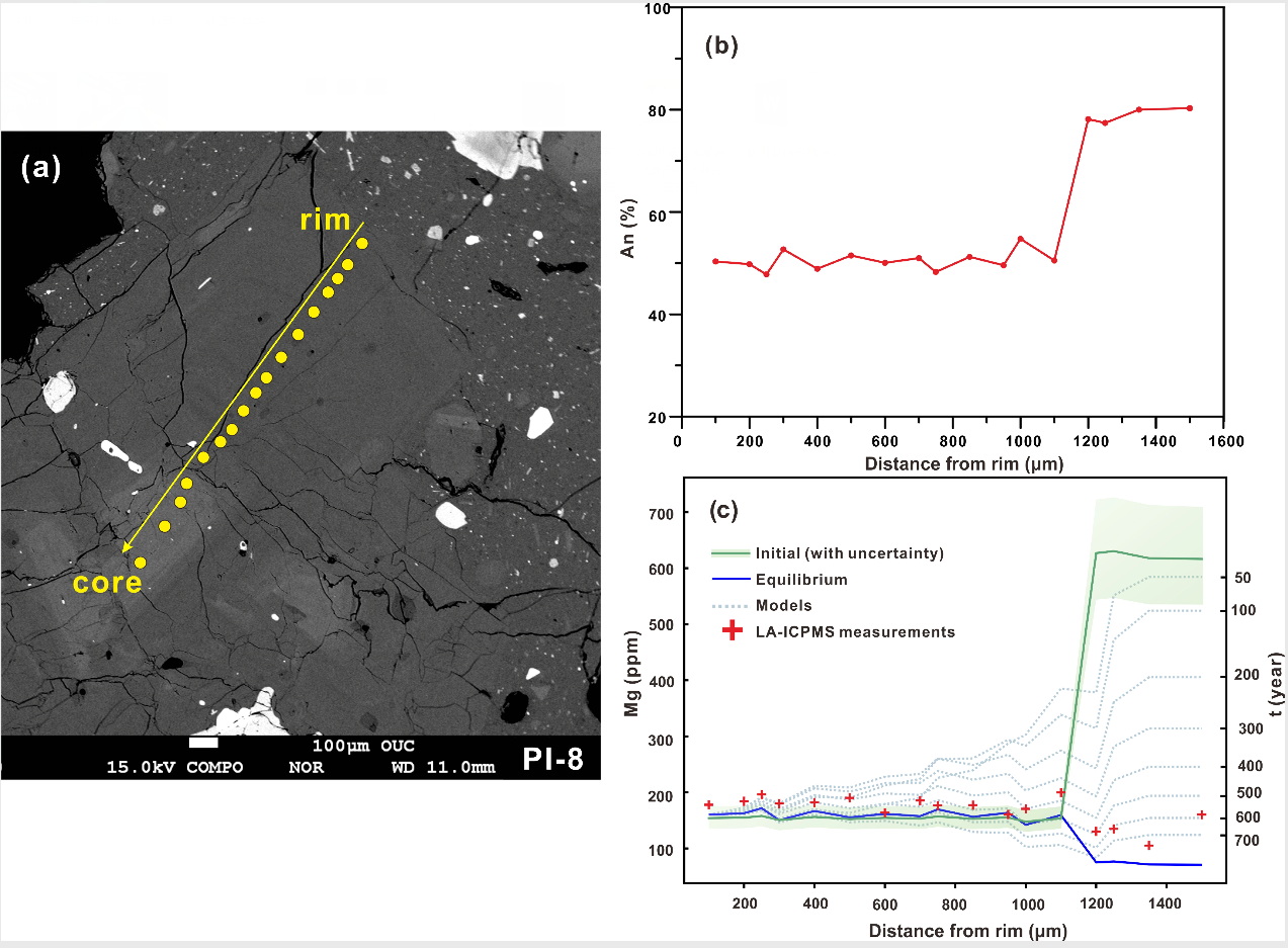 研究人员利用Mg元素在斜长石中的扩散速率结合扩散方程(菲克第二定律),利用有限差分的数值方法模拟计算出钙质斜长石核部进入浅层岩浆房后经历了很长的滞留时间(可达600年),说明热液区浅部岩浆房具有较长的持续时间。而包体和寄主英安岩中斜长石不同的Sr同位素,尤其是钛磁铁矿成分的显著差异(钛磁铁矿晶体内阳离子扩散速率快,易达到扩散平衡),反映了基性岩浆注入浅层岩浆房中形成包体到岩浆喷发必须发生在很短的时间内(几十天),从而抑制包体与寄主英安岩发生完全化学平衡。因而,基性岩浆的注入很可能触发了英安质岩浆的喷发。