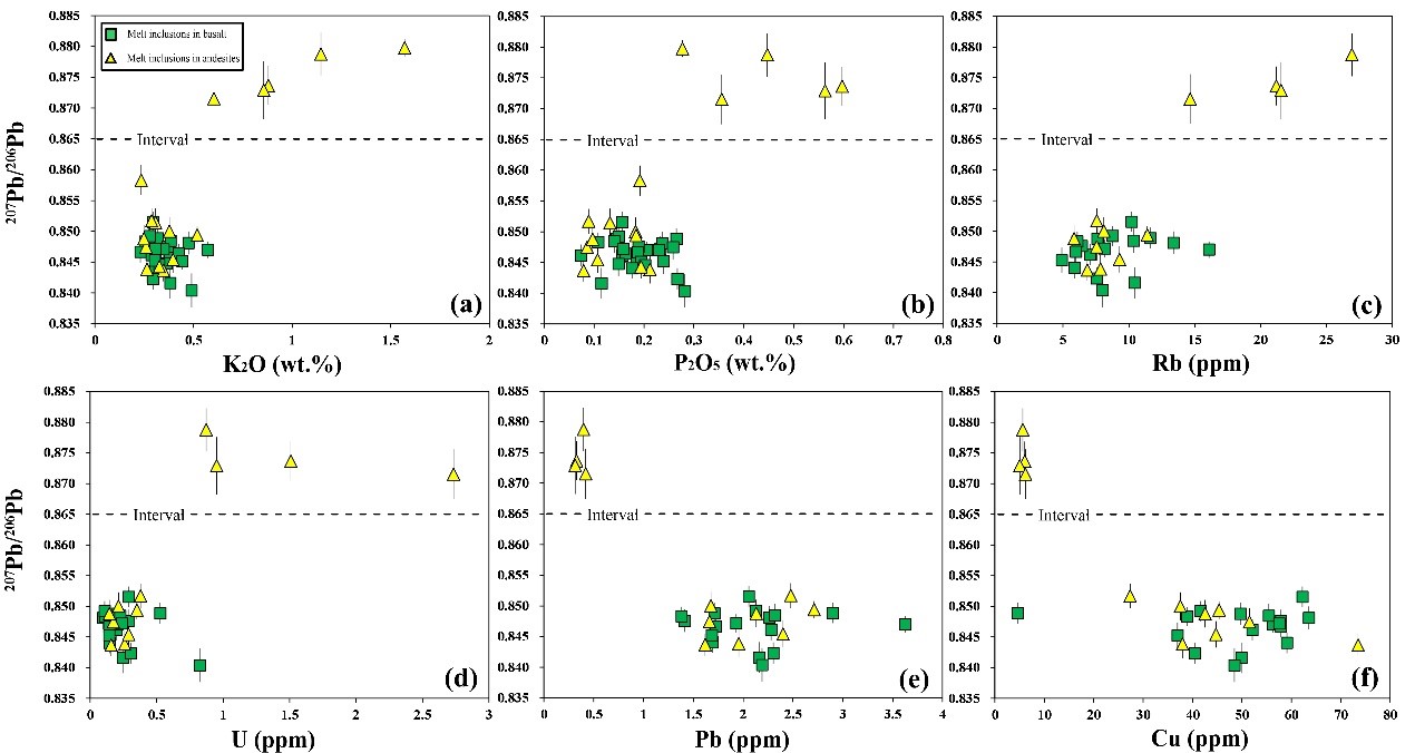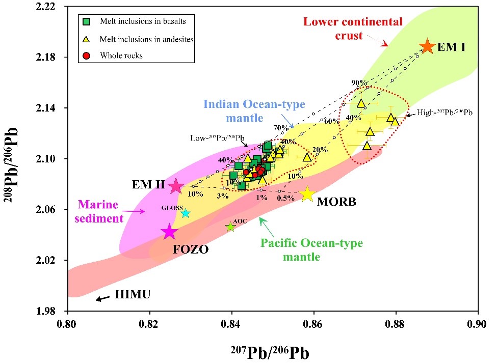 通过对熔体包裹体数据的模拟计算显示岩浆源区受MORB、来自下陆壳的EMI成分和来自沉积物的EMII成分不同程度的混合。安山质火山岩主要来自于同源玄武质岩浆的分离结晶,同时受到了部分具有高207Pb/206Pb,高K2O、P2O5、Rb、U,低Pb、Cu含量熔体的混合,表现出岩浆成分的不均一特征。熔体包裹体中与全岩成分不同的高207Pb/206Pb熔体的存在,表明岩浆演化过程中外来熔体很容易被全岩组分掩盖,导致部分演化信息的丢失。