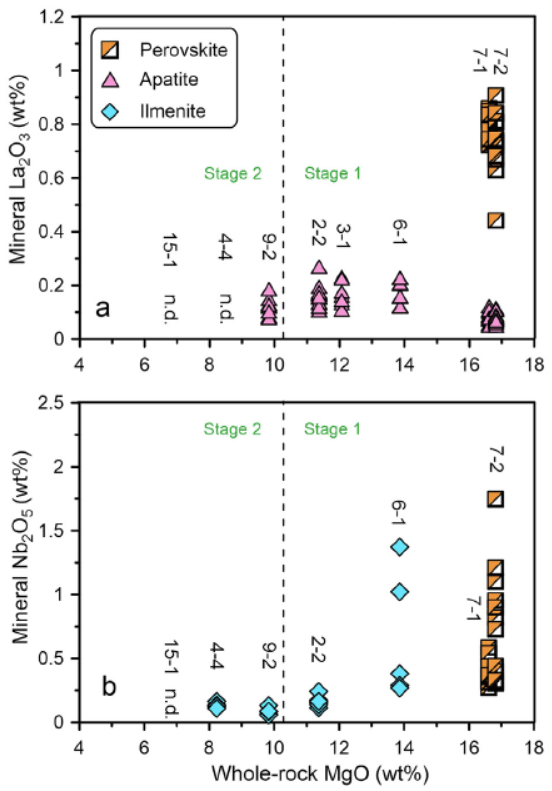 该研究团队对代表Caroline海山链晚期火山活动的波纳佩洋岛碱性火山岩进行了系统的岩石学、矿物学和地球化学研究,发现这些火山岩含有被碳酸岩熔体广泛交代的地幔橄榄岩捕掳体(斜方辉石被交代为富钙单斜辉石),且全岩化学组成表现为两个阶段的演化过程,在第一阶段演化过程中主要表现为碳酸岩熔体交代特征的高稀土元素和亏损高场强元素组成,以及很低的SiO2含量(~34 wt.%),在演化过程中逐渐失去大量稀土元素和高场强元素,SiO2含量明显逐渐升高,Sr-Nd等同位素组成也逐渐变得亏损,同时演化过程中发生了岩浆脱碳作用。这些碳酸岩熔体在演化过程中结晶出大量钙钛矿(Nb2O5 达1.8 wt.%,La2O3达0.9 wt.%)、磷灰石(La2O3达0.5 wt.%)和钛铁矿(Nb2O5达1.4 wt.%)。