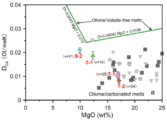 Ca在橄榄石中异常低的分配系数显示出熔体中CO2的影响
