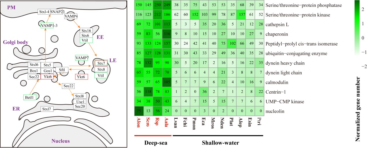 研究人员以公共数据为基础,开展大数据深度挖掘,通过对4个深海和10个浅海十足目甲壳动物的比较转录组学分析,发现了深海物种趋同进化的关键分子证据。系统发生分析显示这些深海物种起源于不同祖先,其相似表型的产生并非直系遗传。进一步分析发现发现,深海物种中SNARE介导的膜泡运输通路是受很强的正选择和平行进化的通路,其大分子特异性运输的功能在化能合成营养代谢过程中扮演着重要角色,且能量代谢和蛋白质合成与加工相关基因的趋同进化也与化能合成的营养机制密切相关。深海热液甲壳动物白色体色的形成则与甲壳蓝蛋白基因家族的收缩以及低虾青素含量有关。