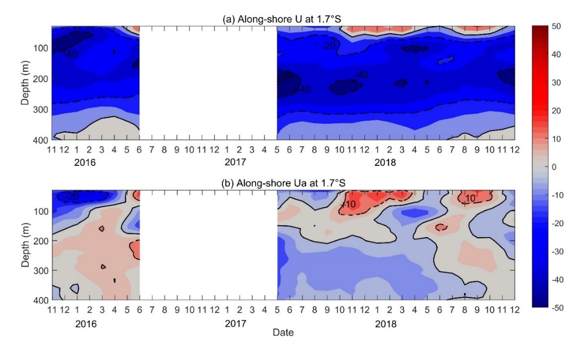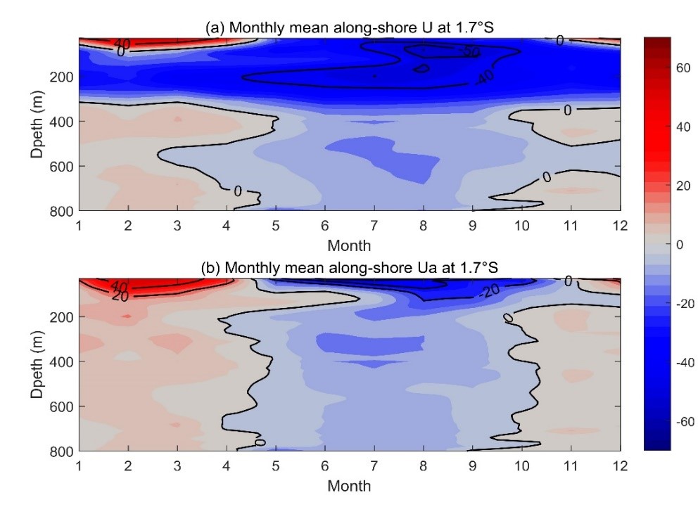 潜标站点(1.7°S,141.4°E)ADCP测得的上800 m沿岸速度(a)和速度异常(b)的月平均