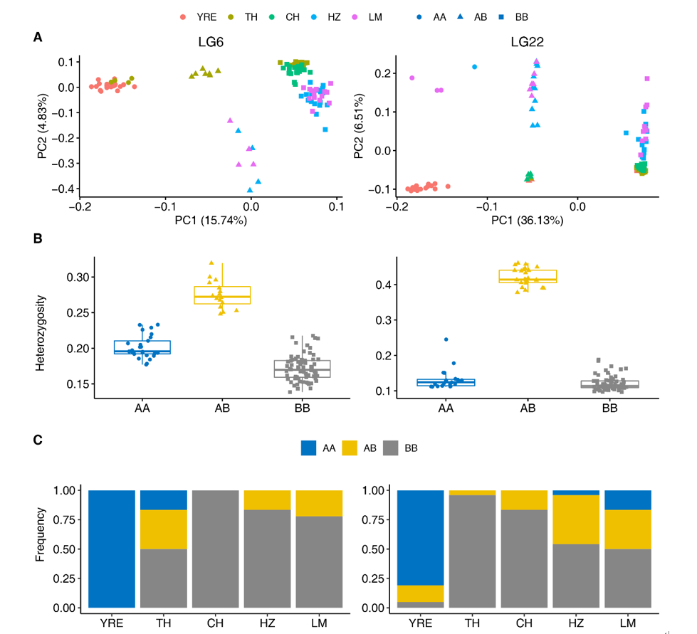 刀鲚两处与平行演化相关的染色体倒置特征:(A)基于倒置区域SNP的PCA散点图(B)倒置区域不同染色体核型的个体杂合度分布(C)倒置区域不同染色体核型在不同种群的频率