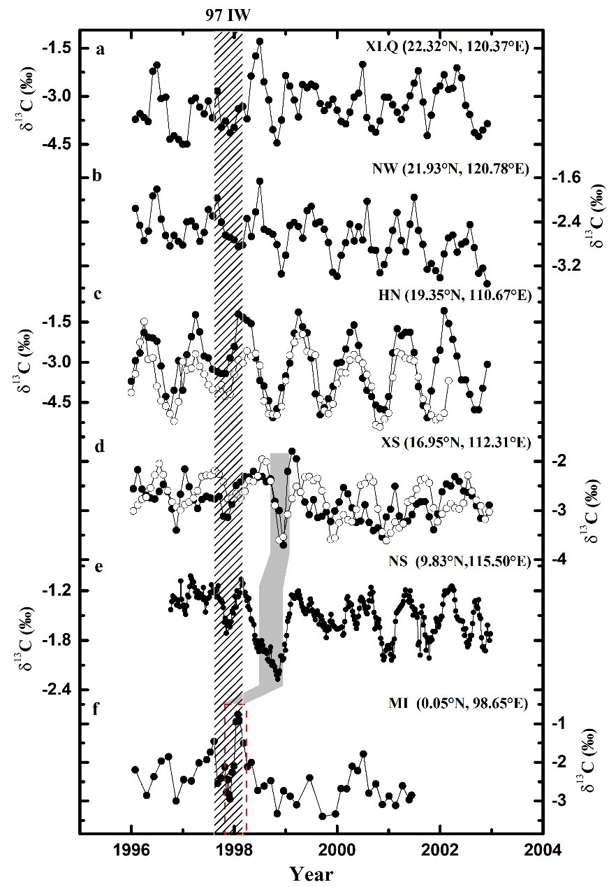 珊瑚碳同位素时间序列。(a)小琉球,(b)南湾,(c)海南,(d)西沙,(e)南沙,(f)Mentawai Islands。灰色阴影区域表示西沙和南沙珊瑚δ13C显著负漂。红色虚线区域表示MI珊瑚δ13C显著增加。条纹区域表示1997年印尼大火的持续时间
