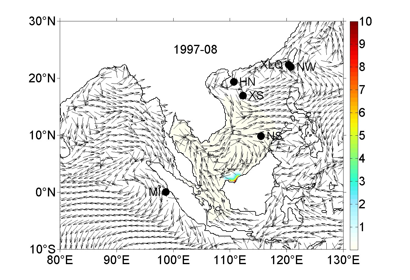 OGCM模型模拟的1997年8月–1998年12月Cfire的移动路径和相对含量变化