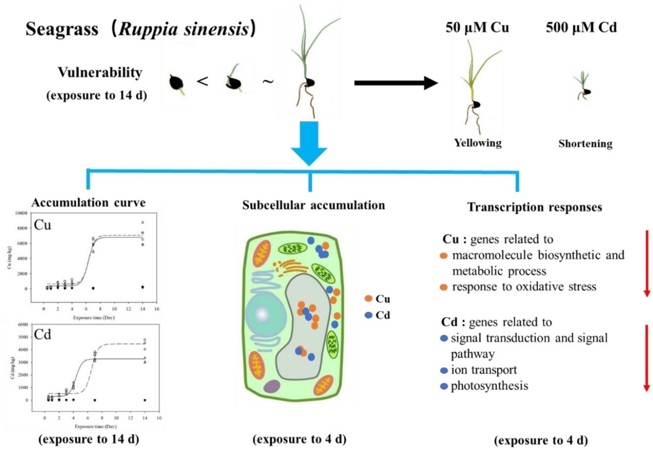 近日,国际学术刊物Journal of Hazardous Materials (IF=9.038) 在线刊发了海洋大科学中心杨红生研究团队最新研究成果“Programmed responses of different life-stages of the seagrass Ruppia sinensis to copper and cadmium exposure”。该研究解析了海草植物——中国川蔓草(Ruppia sinensis)不同生活史阶段对铜(Cu)和镉(Cd)的耐受性及毒性效应机制。研究结果为理解沉水植物对重金属元素的吸收与减毒机制提供了新视角。此外,结果还展现了中国川蔓草这一物种对于水环境中Cu、Cd的生物指示与修复潜力。