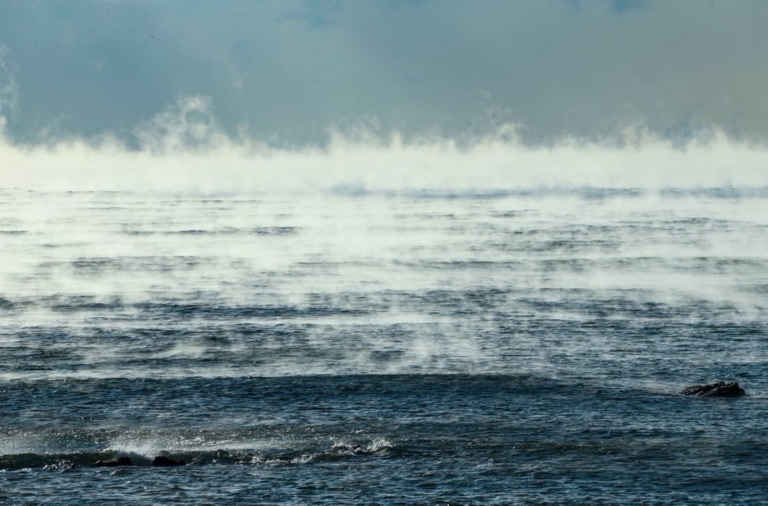 图1. 2021年1月青岛近海发生的平流雾,当极冷的空气掠过温暖的海面时才发生。摄影时青岛海洋站观测到的海气温差在20℃左右(摄影:王少青)
