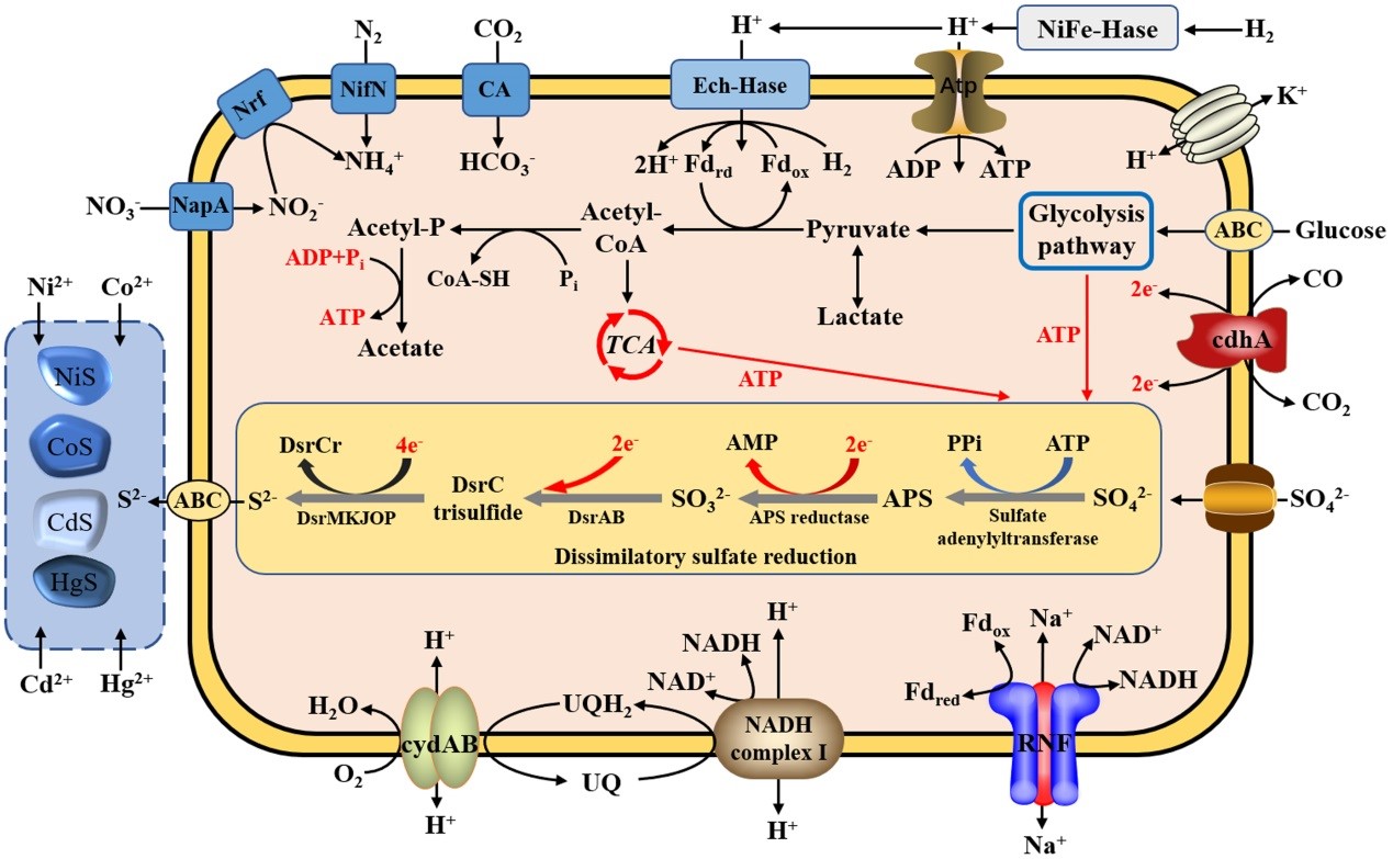 深海冷泉硫酸盐还原细菌硫代谢及硫化重金属矿物质形成模式图