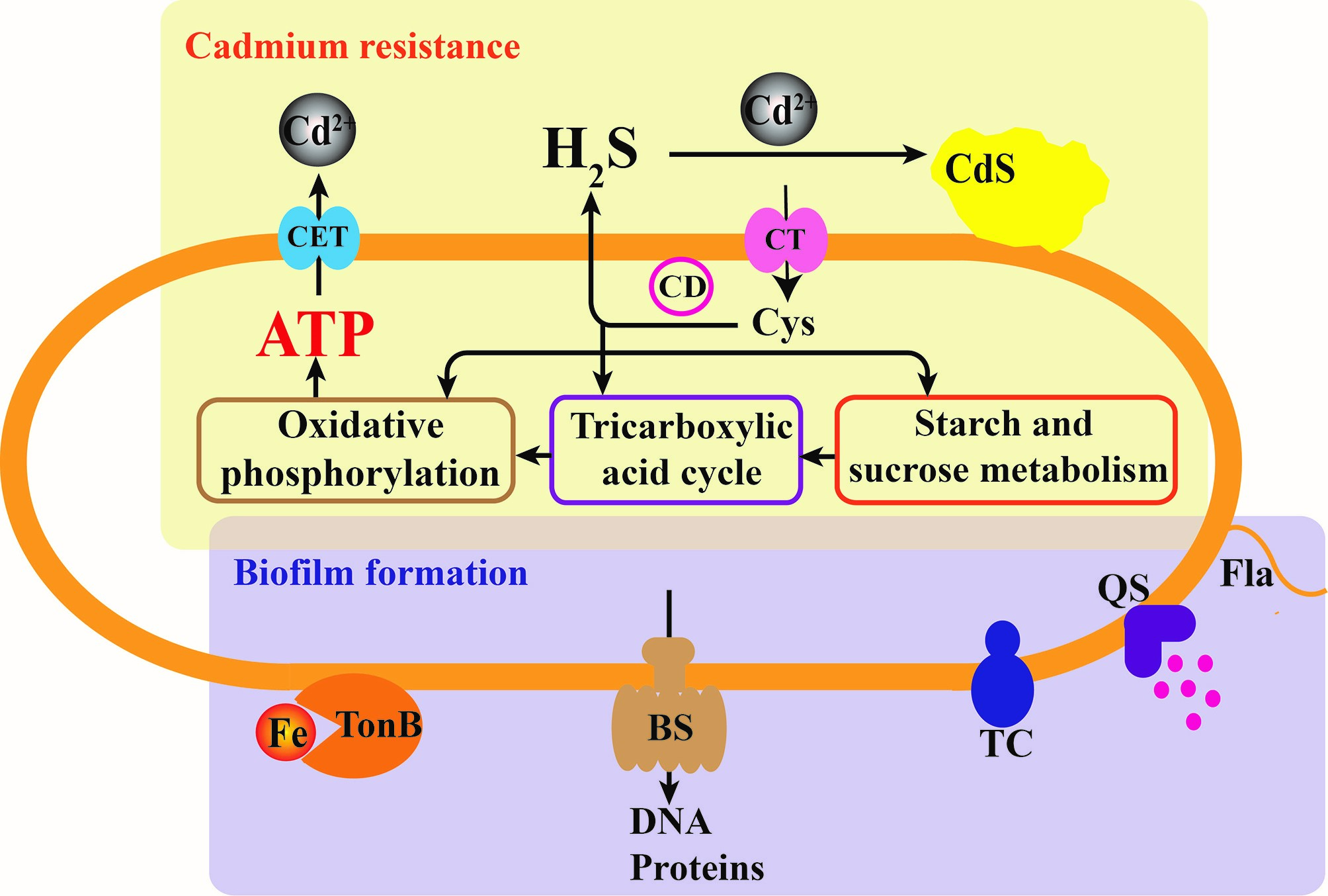 深渊假单胞细菌物质代谢及硫化镉矿物质形成模式图