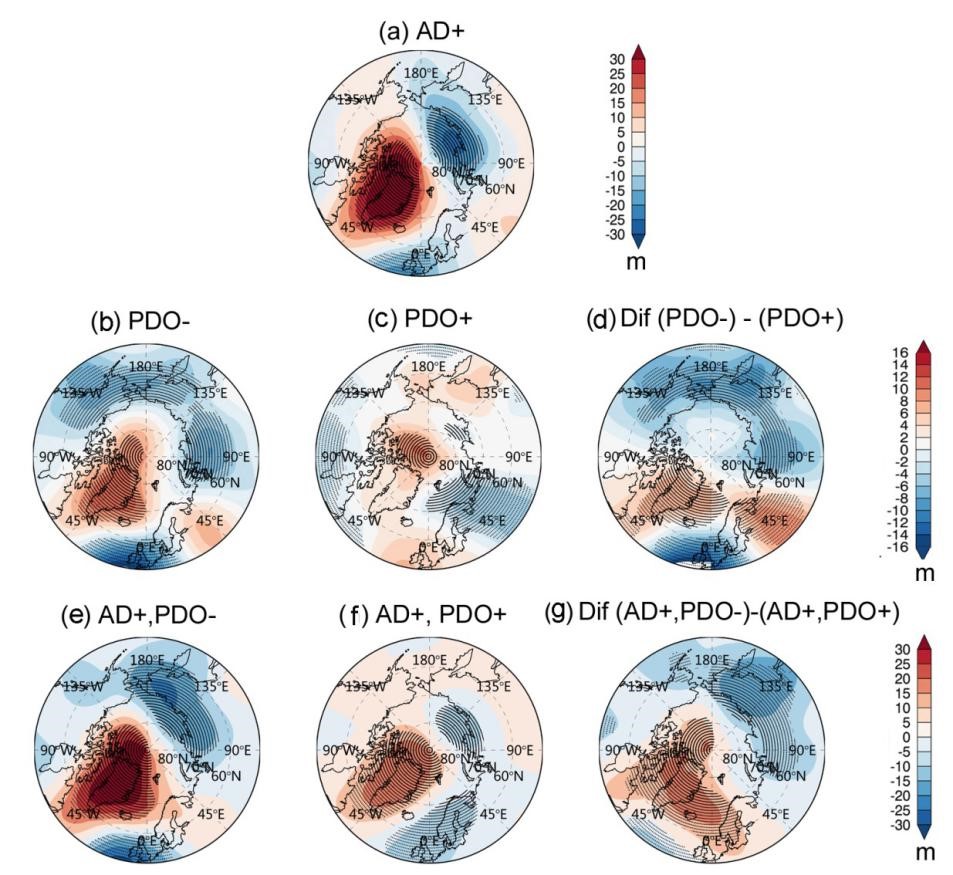 太平洋年代际变化(Pacific Decadal Oscillation,PDO)是描述北太平洋海温变化的重要指数,目前有少量研究指出PDO可对北极地区的大气环流造成一定影响,但没有指出PDO与北极大气环流在何种配置情况下会对夏季北极海冰减少产生显著影响。近日,海洋大科学中心黄海军研究团队首次揭示了太平洋年代际变化的相位更迭对夏季时期北极偶极子DA大气环流模式以及太平洋扇区海冰变化的调控机制。
