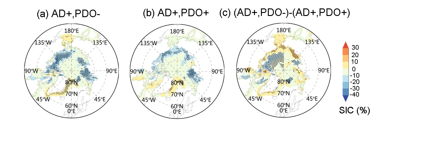研究人员根据卫星观测和再分析气象资料,从新的角度解释了影响北极地区海冰快速减少的新机制。研究团队根据再分析资料结果发现,与PDO正位相时期(PDO+)相比,处于PDO负相位(PDO-)海洋状态条件下的DA+所“支配”的大气环流模态,在加拿大群岛一侧的正压异常和对侧欧亚大陆的负压异常都得到增强(图 1e)。接着研究人员基于近40年的卫星观测资料发现,与DA+相关的反气旋式大气环流对太平洋扇区内边缘海区域海冰密集度变化的影响程度与太平洋年代际变化PDO的相移有关?;谎灾盌A+大气环流模式受到PDO不同相位海洋状态条件的调节,北极太平洋扇区内的海冰密集度将出现显著变化。卫星遥感数据显示在东西伯利亚海(ESS)、波弗特-楚科奇海(BCS)、加拿大北极群岛区域(CAA)的区域平均海冰密集度分别变化了+4.9%、-7.3%和-6.4%(即SIC(PDO-,AD+) - SIC(PDO+, AD+))(图2)。