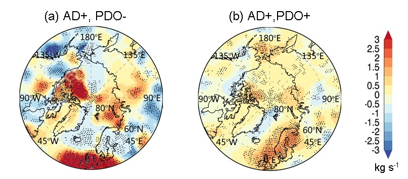 通过分析气象数据资料,研究发现受PDO-(PDO+)海洋背景状态调制作用,DA+相关的大气环流模式可导致BCS和CAA两个区域上空对流层下部(500~1000hPa)的大气比湿度、气温以及由此产生的向下长波辐射异常增强(减弱)。深入分析表明,在这两个区域比湿度和空气温度的异常变化主要与向极水汽输运通量以及水汽和热通量的聚散过程变化相关(图3)。因此,相对于PDO+,在处于PDO-情况下,DA+大气环流造成的这两个区域(CAA和BCS)的海冰密集度时期更小。另外,本文研究揭示海表温度和风应力异常则是造成东西伯利亚海地区海冰密集度显著变化的主要原因。与前人研究结论不同,本文定量计算结果指出云量异常对研究区海冰异常变化的贡献不明显。