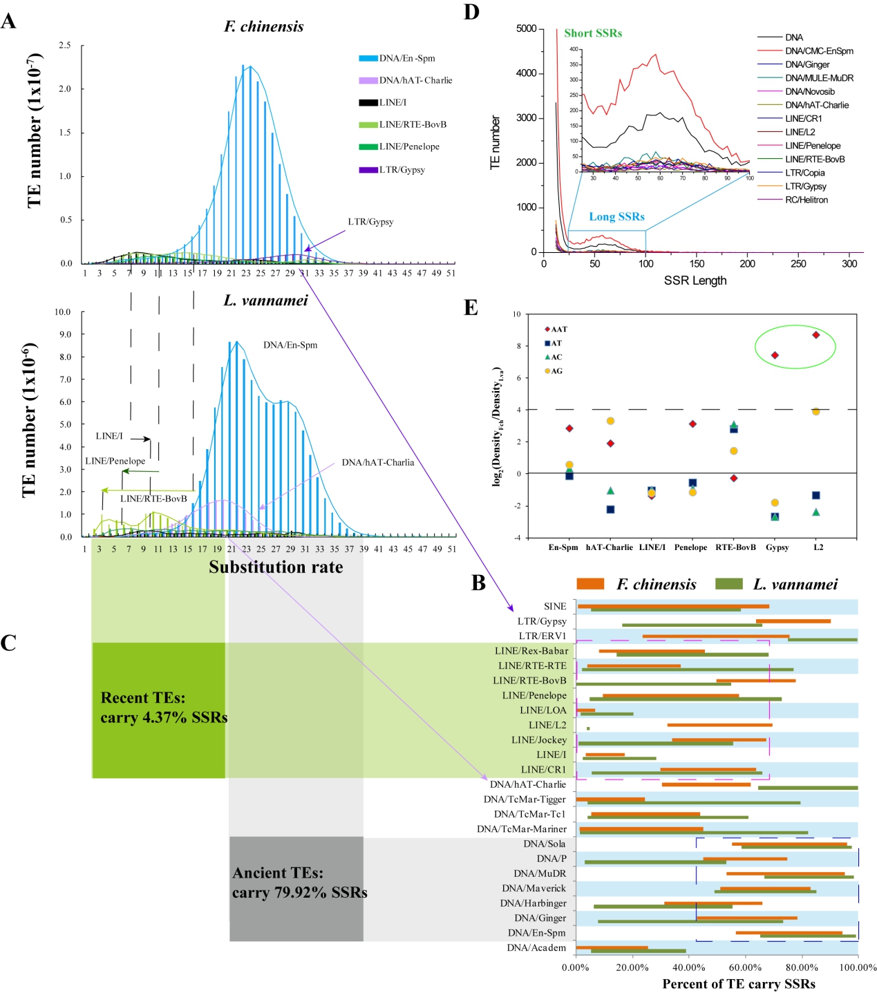 本研究首次发现SSR爆发式扩张的新机制,与传统认为的复制滑动突变模型不同,研究人员发现对虾SSR的爆发式扩张主要与转座元件的携带有关,并进一步鉴定出近期活跃的转座元件,推断其仍具有携带SSR扩张的潜能。此外,本研究发现SSR在对虾基因组可塑性和环境适应中具有重要作用,高密度的SSR分布引起对虾染色体内大规?;蜃橹嘏?。