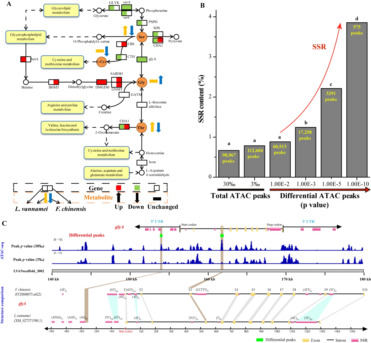 尽管中国明对虾和凡纳滨对虾亲缘关系相近,但是它们在盐度适应能力上却存在显著差异。研究人员首次发现对虾主要通过调控体内自由氨基酸的含量来调节体内的渗透压,而SSR能富集于基因调控区,参与渗透压调节关键通路的基因表达调控。这些基因表达模式的差异可能是引起两种对虾渗透压调控能力差异的重要原因。