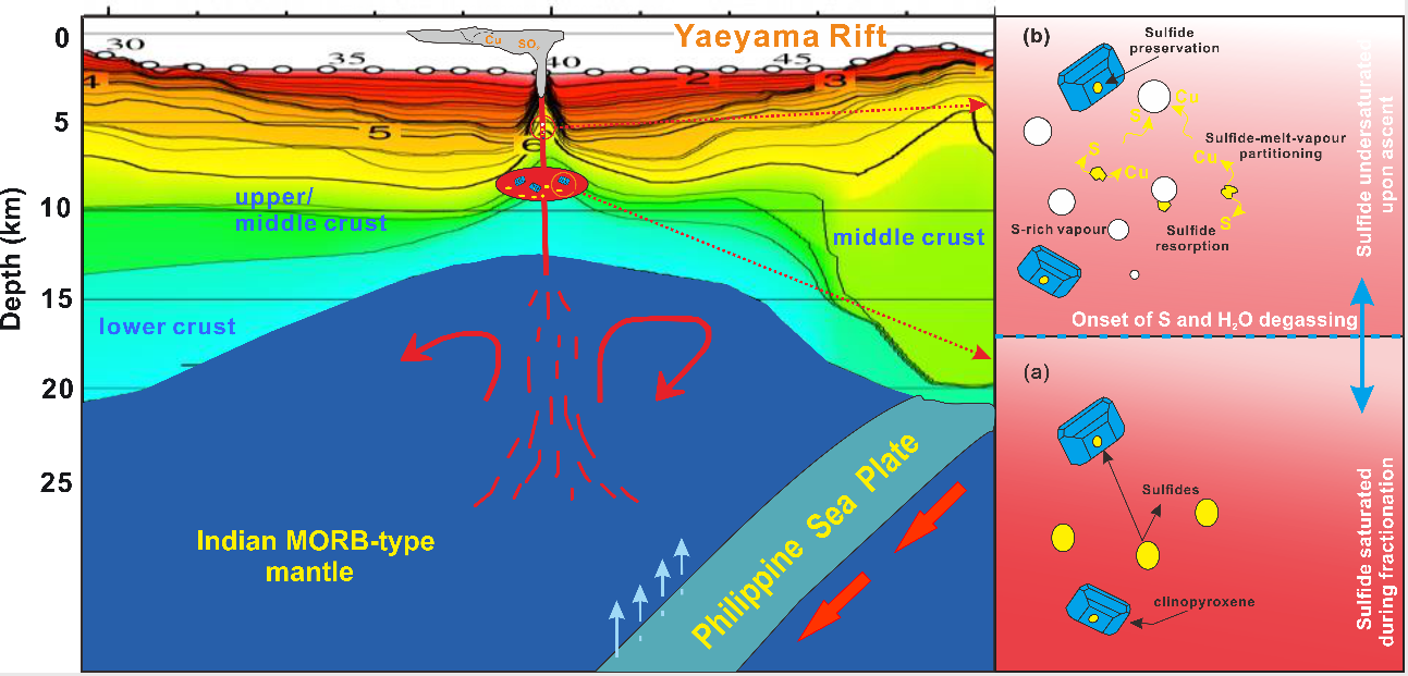 该研究在西太平洋弧后盆地热液区玄武安山岩中发现了岩浆硫化物饱和及溶解现象,通过全岩地球化学和矿物化学的研究,明晰了硫化物饱和时岩浆房深度以及寄主岩浆的温度、氧逸度、含水量和硫含量等特征,揭示了岩浆分异过程中熔体的硫含量增加以及温度降低、熔体成分变化可导致硫化物饱和时所需硫含量的降低,并共同驱使玄武安山质岩浆的硫化物饱和。随后,岩浆上升喷发过程中挥发份(H2O、S等)的去气/出溶作用将导致其携带的硫化物发生溶解。由于岩浆中硫化物作为亲铜元素最主要的寄主矿物,该溶解过程将使Cu重新进入熔体中,并再分配进入出溶的岩浆流体,从而形成富金属元素的岩浆流体,其在同喷发去气过程中可直接释放进入海底热液系统的流体和/或海水中。