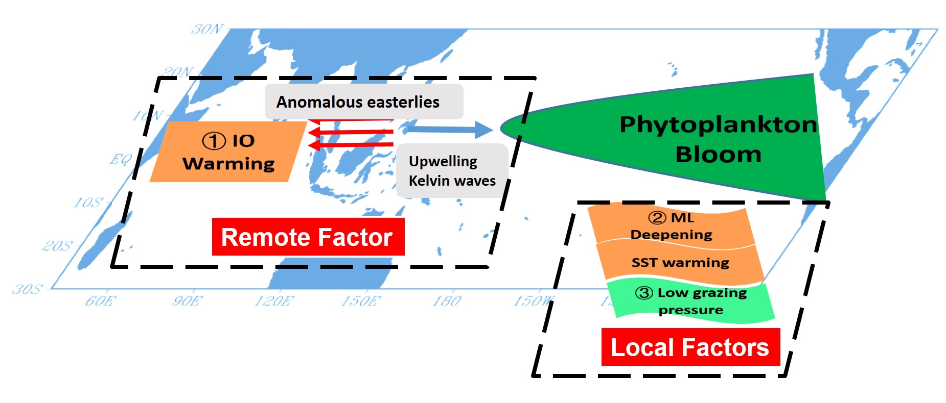 课题组利用多源观测数据、CMIP6气候模式模拟结果和海洋生物地球化学耦合模拟试验,发现印度洋变暖在远程触发1998年和2010年赤道东太平洋的超级浮游植物爆发中扮演着重要作用。具体地,在El Nino发展年的冬季,印度洋变暖在印太海洋性大陆和热带西太平洋边缘产生东风异常,激发了沿赤道向东传播的上升Kelvin波,于次年春季在东太平洋中抬升营养盐跃层;同时,东太平洋上层季节性增暖和季节混合层开始加深,导致富含大量营养盐的次表层冷水更易卷夹进入混合层。另外,在El Nino发生年,热带太平洋气候和海洋生物地球化学过程产生显著的年际异常,如伴随着浮游动物摄食压力减弱等。这样,印度洋增暖引发的跨洋盆的远程效应和赤道中东太平洋局地气候和海洋生物地球化学过程间协同作用促进了东太平洋浮游植物的爆发增长。