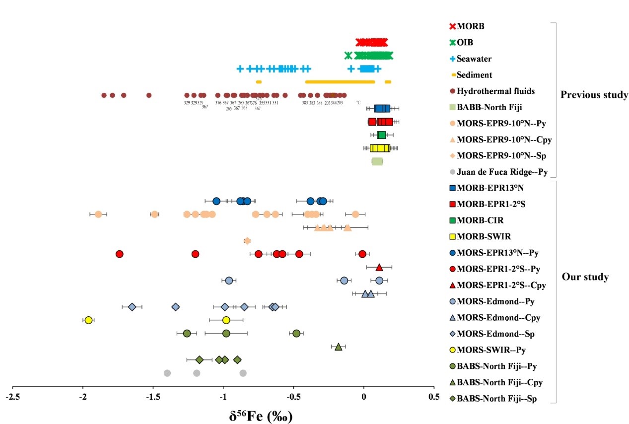 海底火山岩和硫化物中的铁、铜和锌同位素组成研究为理解岩浆、热液和蚀变过程提供了重要工具,有助于确定过渡金属的来源和热液活动对岩石环境的影响。通过研究,团队明确了洋中脊玄武岩的δ56Fe和δ57Fe值高于海底热液,而δ66Zn和δ68Zn值则相反,这表明玄武岩-流体相互作用优先将54Fe、66Zn和68Zn结合到流体中,导致了56Fe、57Fe和64Zn在蚀变玄武岩中的富集。硫化物矿物的δ56Fe值大部分(-1.96~+0.11‰)在喷口流体范围内,但明显低于洋中脊和弧后盆地玄武岩,说明硫化物中的Fe主要来源于喷口流体?;仆蟮摩?6Fe和δ57Fe值高于闪锌矿和黄铁矿。这表明高温硫化物矿物富集56Fe和57Fe,而中低温硫化物则亏损56Fe和57Fe。