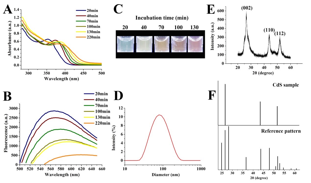 rTD催化的半胱氨酸脱硫过程分为两步:首先半胱氨酸和水反应生成L-丝氨酸和硫化氢,进而L-丝氨酸进行脱氨作用生成丙酮酸和氨气(图2)。最后,研究人员建立了硫化镉纳米颗粒生物合成单酶体系,该体系以rTD作为催化酶、以半胱氨酸作为硫供体、以氯化镉作为镉供体,可高效催化硫化镉纳米颗粒的合成(图3)。其中rTD除了作为催化酶控制反应进程之外,还具有包被物的作用,能够控制硫化镉纳米颗粒的形成速度和颗粒粒径,该研究成果已申请国家发明专利。值得一提的是,该株假单胞菌分离自“科学号”从海山采集的样品,还具有良好的汞脱除能力,能产生抑制多重耐药性铜绿假单胞菌生物膜形成的多糖,在环境?;ず蜕镆揭┝煊蚓哂辛己糜τ们绷?。