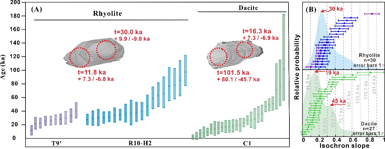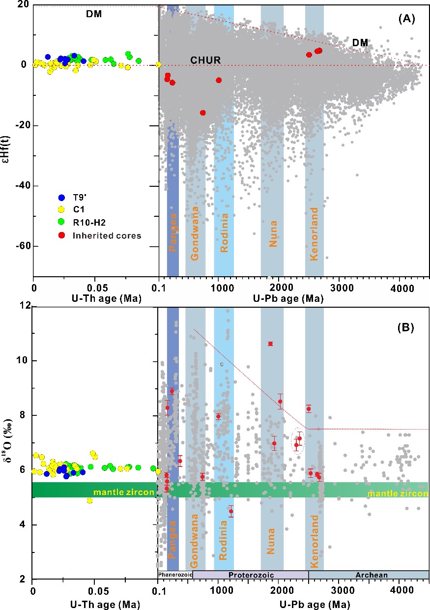 本研究发现冲绳海槽热液区火山岩中存在两种不同类型的锆石,类型1为亮色的阴极发光图像(CL),年龄非常年轻(3.1千年-101.5千年)且跨度约100千年,相对均一的Hf-O同位素组成,稀土元素(REE)配分模式上表现出铕(Eu)显著负异常和陡峭的重稀土元素配分模式;类型2为暗色的CL图像,被包裹在年轻锆石的核部,年龄相对较老(108百万年-26亿年),与大陆拼合事件相吻合,且Hf-O同位素组成变化范围大。同时,两者均具有明显的震荡环带、自形程度比较好和Th/U比值大于0.4的特征,指示其为典型的岩浆锆石。