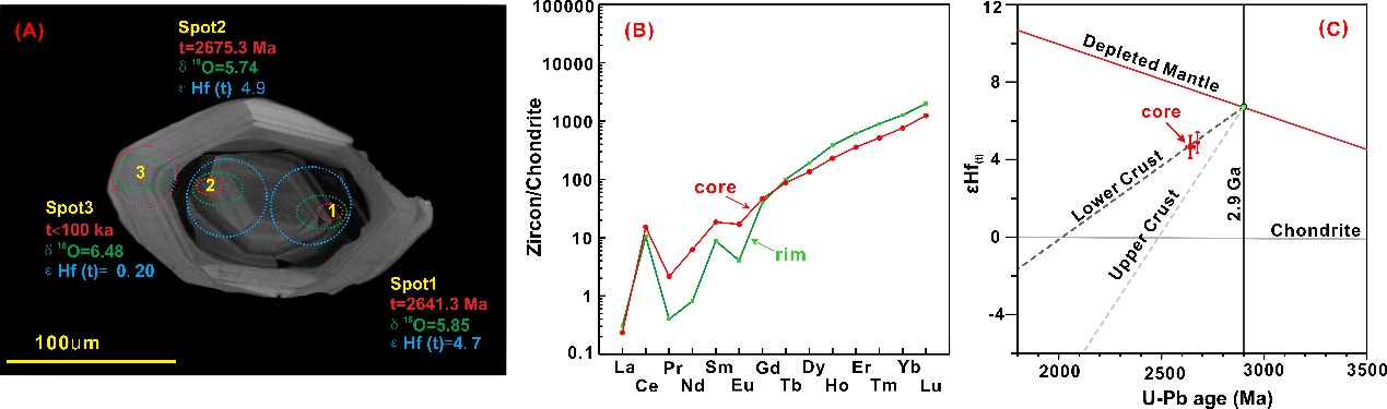 年轻锆石的太古代继承核(约26亿年)具有接近地幔锆石的O同位素组成和正的初始Hf同位素组成特征(δ18O=5.74-5.85;εHf(t)=4.7-4.9),在REE配分模式上无显著的Eu负异常,加之二阶段Hf模式年龄为~29亿年,且位于下地壳演化线上,指示其物源来自中太古代的新生下地壳。不仅如此,冲绳海槽热液区火山岩中元古代以来的继承锆石具有负的Hf同位素组成和高的O同位素组成特征,其年龄分布与大陆拼合事件一致,指示了早期大陆拼合过程中壳幔相互作用增强。因此,陆缘弧后盆地海底热液区火山岩中锆石不仅可以反映区域性的岩浆作用过程及其导致冲绳海槽张裂的持续时间,而且还可以提供早期地壳演化的信息。