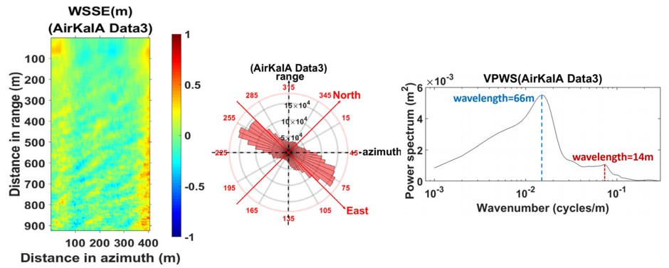 试验结果初步显示出宽刈幅干涉高度计观测的优势,直接呈现出海浪场引起的三维海面高度变化,而之前的大面积海浪场的遥感观测只能通过其对后向散射系数的影响间接体现。高分辨三维海面高度变化的同步观测为海浪研究提供了丰富的信息,而新型数据亟需新的分析方法。徐永生团队继而开发了第一个基于三维高度变化的海浪参数反演方法,能够精确获取海浪波向、波长、有效波高等参数,成果近期在国际学术期刊 IEEE Geoscience and Remote Sensing Letters在线发表,文章第一作者是徐永生团队在读博士生姜秋富,徐永生研究员为共同第一作者兼通讯作者。