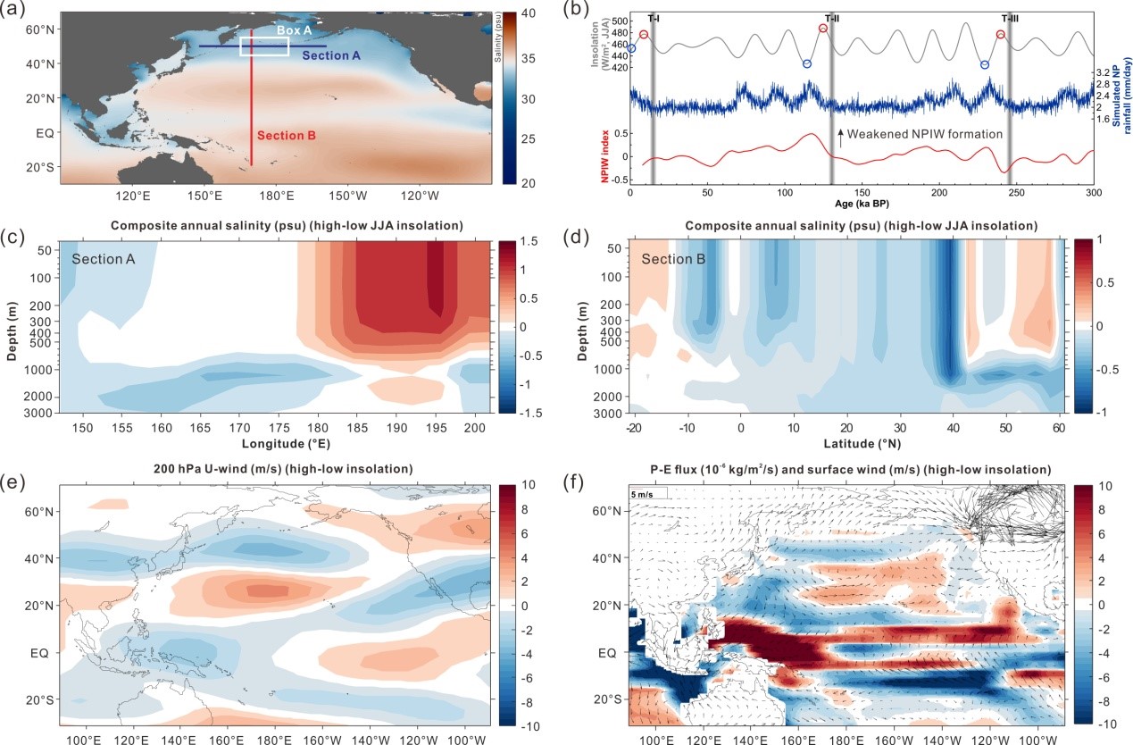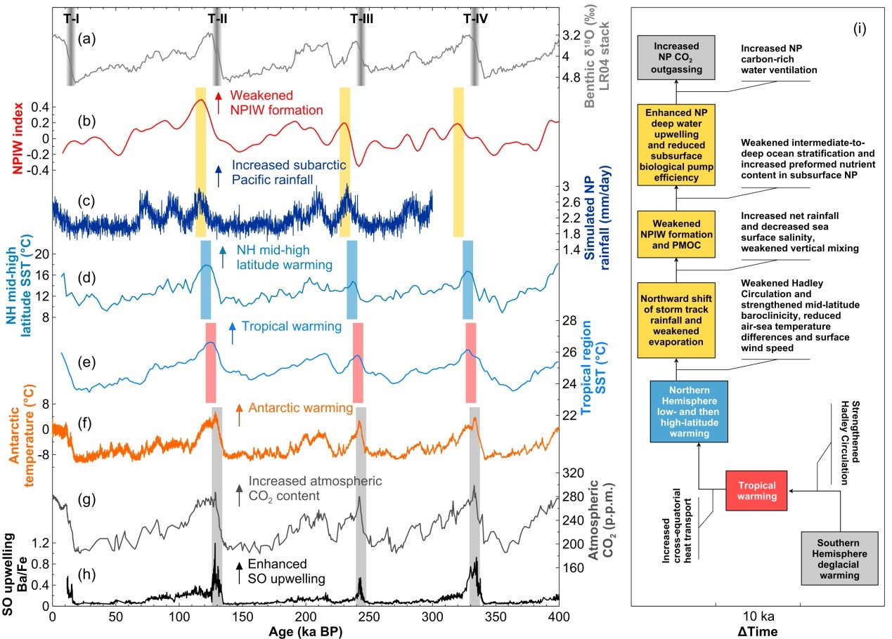 冲绳海槽水体氧化还原状态可以受到北太平洋中层水的强烈影响,因此是研究北太平洋中层水演化的理想区域。据此,研究人员利用冲绳海槽沉积物氧化还原敏感元素恢复了过去40万年以来的水体氧化还原演化历史,基于此进一步重建了北太平洋中层水演化历史。研究发现,北太平洋中层水的形成在冰期较强,间冰期相对较弱。但从冰期到间冰期减弱的过程要晚于南大洋冰消期上升流的增强(即南大洋碳释放)约1万年。结合模拟结果,研究人员发现,该滞后的现象主要响应于南北半球间热量的传输时间差异,其导致的经向温度梯度变化控制着北太平洋净降水量的变化,进而影响该区域水团的下沉以及中层水的形成。间冰期减弱的北太平洋中层水使得底层水与上部水体分层性减弱,从而有利于上升流的形成和深部碳的释放,这可能对维持间冰期大气CO2的高位水平做出了一定贡献。