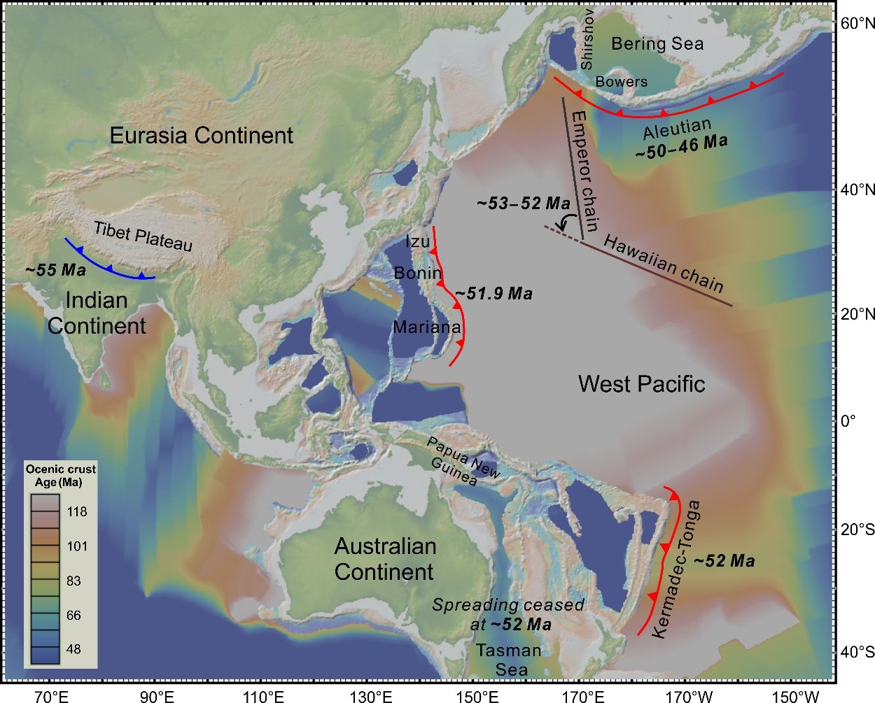 中国科学院海洋大科学研究中心孙卫东研究团队发现约五千三百万年前,印度板块和澳大利亚板块几乎同时与欧亚板块发生硬碰撞,在形成青藏高原的同时,引发了太平洋板块向西北俯冲。论文在线发表在Science Bulletin...2020-09-18