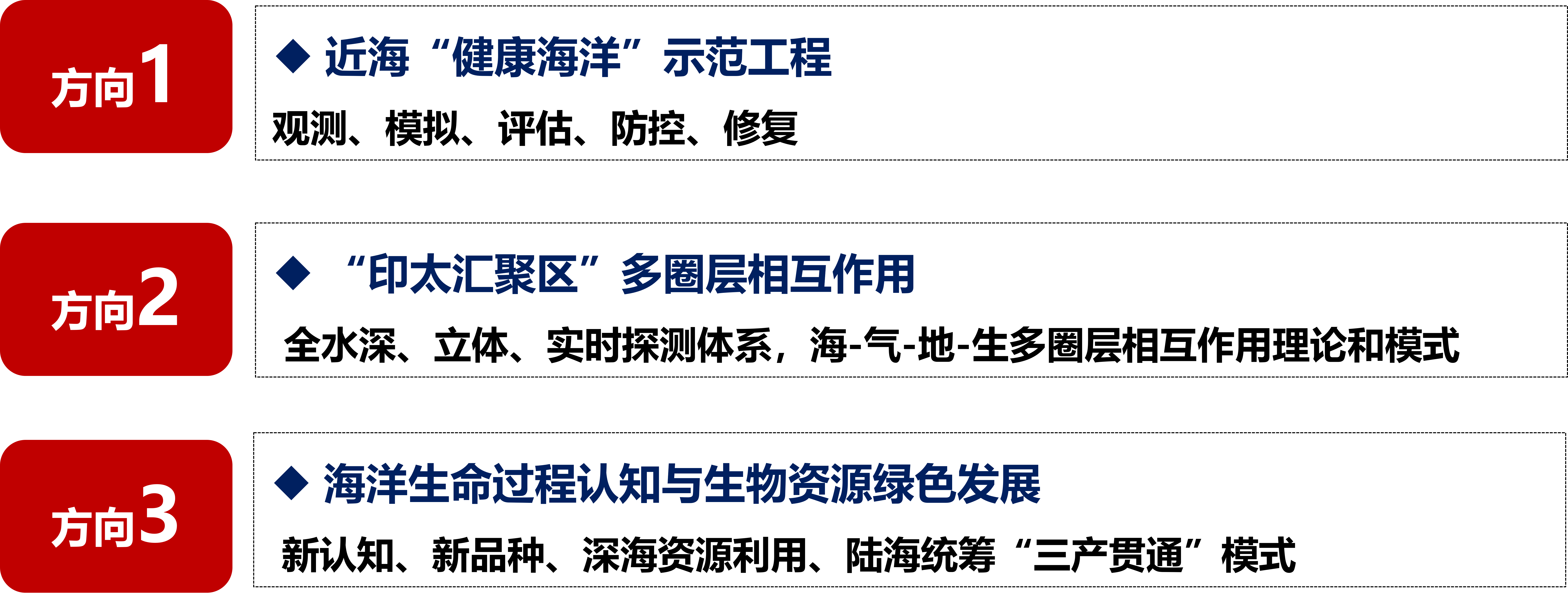 聚焦海洋生命、近海-海岸带环境、深海大洋三大领域,立足近海和海岸带环境演变与生物资源可持续利用理论创新与关键技术的综合交叉与系统集成,拓展深?;肪秤胝铰孕宰试刺剿鞯南鹊夹匝芯?,部署三大科研方向,构建核心科研单元。