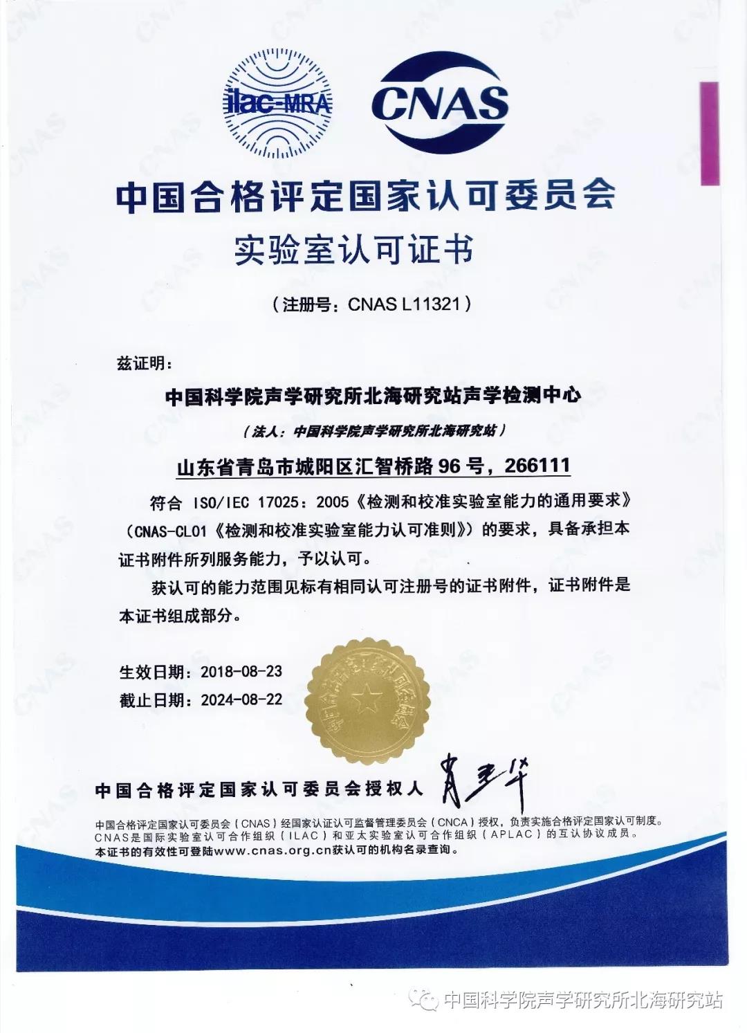中国科学院声学研究所青岛分所暨北海研究站声学检测中心顺利获授CNAS/CMA实验室认可证书